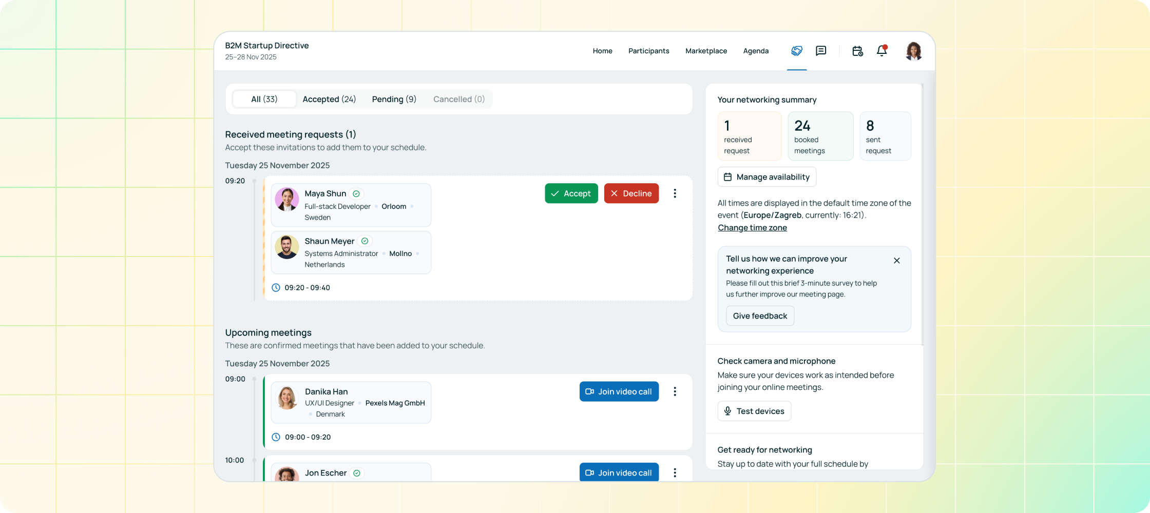 Plus, it provides quick access to manage their availability or test their camera and microphone before joining online meetings. This combination of clarity, control, and connectivity makes it easier than ever for participants to match, meet, and make meaningful connections.